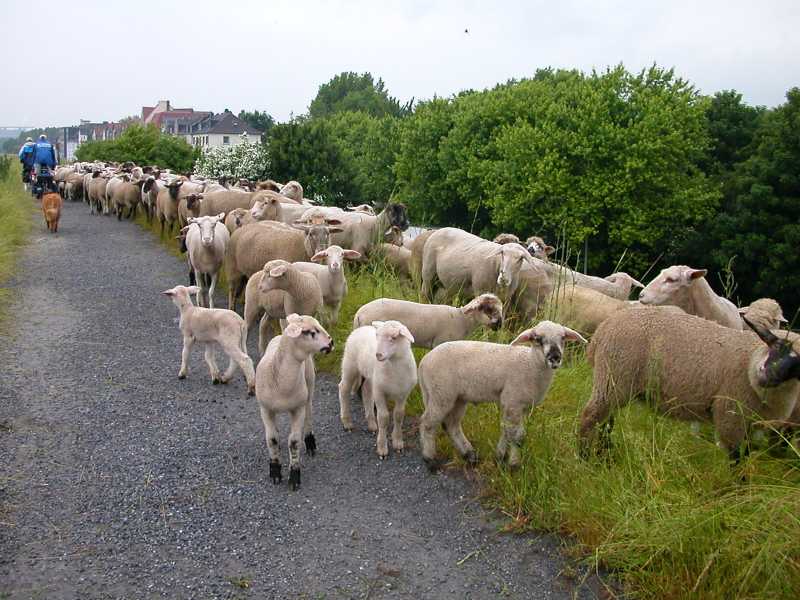 Schafe auf dem Rheindamm Durch diese Herde mußten wir um 18:07 Uhr in Duisburg. Auf die anderen, die nicht so schnell durchkamen, mußten wir warten. Richtiges Schmuddelwetter. |