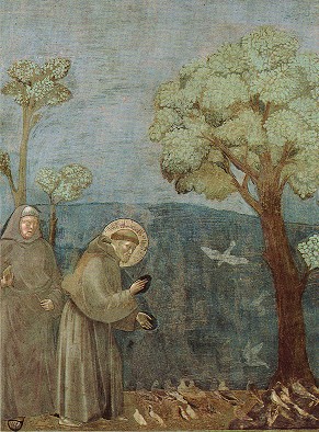 Die Versuchung von seiten der Schüler liegt natürlich nahe, sich während dieser Gruppenarbeit auf Deutsch zu unterhalten. Jedoch erscheint mir der Auftrag, dass die Arbeitsergebnisse auf einer Folie und der Vortrag auf Englisch wiedergegeben werden müssen, genug Motivation, sich schon allein deswegen auf Englisch zu unterhalten. Wörterbücher sollten natürlich als Hilfe gegeben sein. Nach dem Beitrag einer jeden Gruppe sollte den anderen auch die Möglichkeit gegeben werden, das Ergebnis auszudiskutieren. Sind die Beiträge auf einer Folie zusammengefaßt worden, können die anderen Gruppen die Gedankengänge auch gleich gut mit nachvollziehen. Die Tafel mag eine Hilfe zur Strukturierung der Diskussion sein. Es bestünde auch die Möglichkeit eines Schülervortrages, vielleicht sogar von einer Person, die den Hl. Franziskus als Namenspatron hat, der durch Dias unterstützt werden könnte. Ich habe mich aber zu einem Dialog der Schüler untereinander entschieden, da häufig ein Konzept zum ganzen Lebenslauf des Heiligen den Zeitrahmen sprengen würde. Nach einem gut geplanten Vortrag läge zudem erst eine Sättigung der Schüler mit hinreichend Informationen vor, so dass ein erneutes Diskussionsgespräch zum direkten Vergleich mit Bernard Malamud’s The Assistant sicherlich darunter leiden würde. Sollte allerdings die Bereitschaft einiger Schüler, die Assisi schon einmal aufgesucht haben, da sein, auf diese Stadt und ihre Glaubenszeugen in Umbrien, so auch die Hl. Clara, einzugehen, dürften sie meines Erachtens keinesfalls an ihrer Motivation gehindert werden. Nach der Beschäftigung jeder Gruppe mit einer vergleichenden Analyse, kann zum Abschluss durch einen nochmaligen Methodenwechsel anhand eines Lehrer – Schüler – Gesprächs diskutiert werden, welches Ziel Malamud überhaupt mit einem solchen Vergleich in seinem Werk angestrebt hat. Weiterhin lässt sich zur Diskussion stellen, wie Frank Alpine nun zum Judentum und zum Christentum steht. Als Hausaufgabe könnte eine kreative Aufgabe gestellt werden, die auf die Frage eingeht, wie das Leben von Helen Bober und Frank Alpine weiter verläuft. Eine andere Möglichkeit zur Reflexion der Person des Franz von Assisi könnte sein: "Wie wäre Franziskus und was täte er, wenn er heute lebte?" Gerade für die Sekundarstufe II halte ich es für sinnvoll, dass sich Schüler Gedanken zu Problemen in heutiger Zeit machen. Immer wieder müssen Menschen gefunden werden, die sich für Lösungen einsetzen, wobei es für sie oft nötig ist, dann "gegen den Strom zu schwimmen". Bei der Planung dieser Doppelstunde habe ich mich bemüht, alle vier Grundfertigkeiten (Lesen, Sprechen, Schreiben, Hören) einzubeziehen. Damit allen Schülern nachher die Arbeitsergebnisse aller Gruppen vorliegen, wäre es sinnvoll, die erarbeiteten Folien eventuell zu verkleinern und dann für alle anhand einer Kopie zugänglich zu machen. 3. Konkrete Anregungen zur Umsetzung im Unterricht3.1. Namen: Frank Alpine und St. Francis of AssisiJeder Schüler wird erkennen, dass Frank Alpine einen Namen trägt, der eine kompakte Anspielung ist. Frank wird sehr leicht als eine Variation von Francis angesehen (Griffith 1972, Item 1), und Alpine bringt mehrere Assoziationen mit sich, die vom Lehrer als Zusatzinformation gegeben werden müssen. Renate Schmidt - von Bardeleben kommentiert: "Wenn man berücksichtigt, dass die Stigmatisierung des Franz von Assisi auf dem Alvernerberg, 'seiner geliebten toscanischen Alpe', geschah, erkennt man, dass der Name Alpino eine weitere Identifizierung mit dem Ordensgründer darstellt." (Schmidt-von Bardeleben 1975, S. 64) John Griffith gibt zu verstehen: "Alpine" implies something of Frank’s aspirations for spiritual elevation; it also refers to the hilly terrain of Francis’ Umbrian homeland (Assisi is built on top of a high hill). It may also refer to the one famous donation which Francis, leery of gifts, consented to take: in 1213 he became owner of La Verna, a mountain. Zum Buchtitel erklärt er: "Malamud may also have been thinking of "Assisi" when he called his book, "The Assistant." Außerdem sind die Initialen (Griffith 1972, Item 1) des Frank Alpine die gleichen wie bei Francis of Assisi, wie Joan Zlotnick bemerkt (Zlotnick 1975, S. 22). 3.2. "Talking to the Birds?" Der Hl. Franziskus und seine gefiederten FreundeNachdem der Lehrer drei direkte Bezüge zu Franz von Assisi mit den Schülern erarbeitet hat, kann sich nun die Gruppenarbeit anschließen, bei der sich die erste Gruppe mit der sogenannten 'Vogelpredigt' befassen soll. Ich habe hier wie auch im Folgenden versucht, Passagen aus relevanten Quellen über das Leben und Lehren des Franz von Assisi bereitzustellen. Dadurch, dass eine Quelle in Form eines Arbeitsblattes mit genauer Arbeitsanweisung vorliegt, ist es möglich, eine vergleichende Analyse zu dem Roman The Assistant vorzunehmen, wobei natürlich davon ausgegangen werden muss, dass das Werk im Vorfeld ganz gelesen wurde. Arbeitsauftrag: Erläutern Sie die Vogelpredigt des Hl. Franziskus! Die Postkarte zur Vogelpredigt soll eine Hilfe sein. An welchem Beispiel erkennen Sie Frank Alpines Verehrung des Hl. Franziskus? Als Grundlage für diese Aufgabenstellung wird folgender Text gegeben: Der Text stammt aus der nach 1322 - 1328 entstandenen Legendensammlung "Die Blümlein des Hl. Franz von Assisi", bekannt auch unter dem Titel Fioretti di San Francesco.